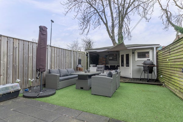 De zonnige achtertuin is verzorgd aangelegd en voorzien van een terras, een gezellige overkapping en een schuur: een fijne plek om het hele jaar door te genieten.