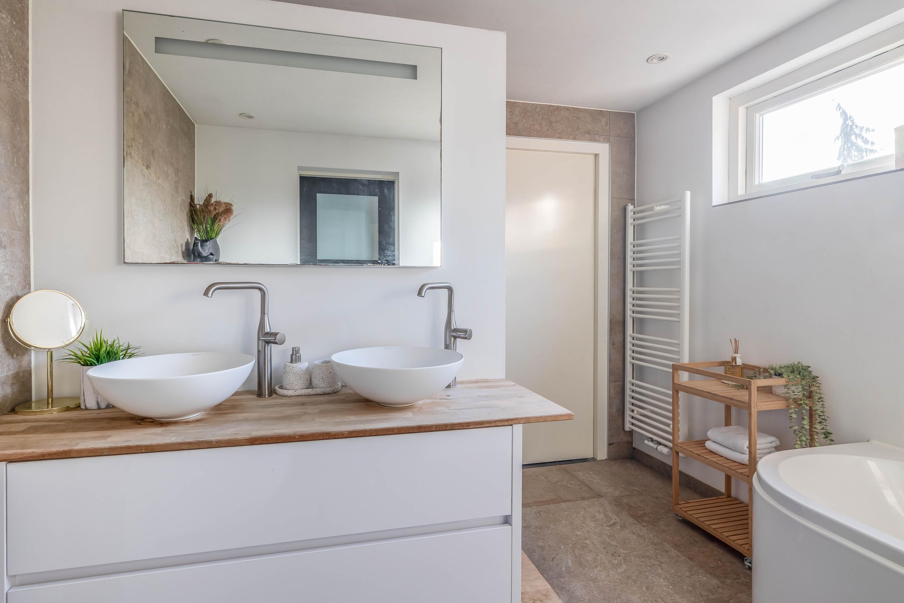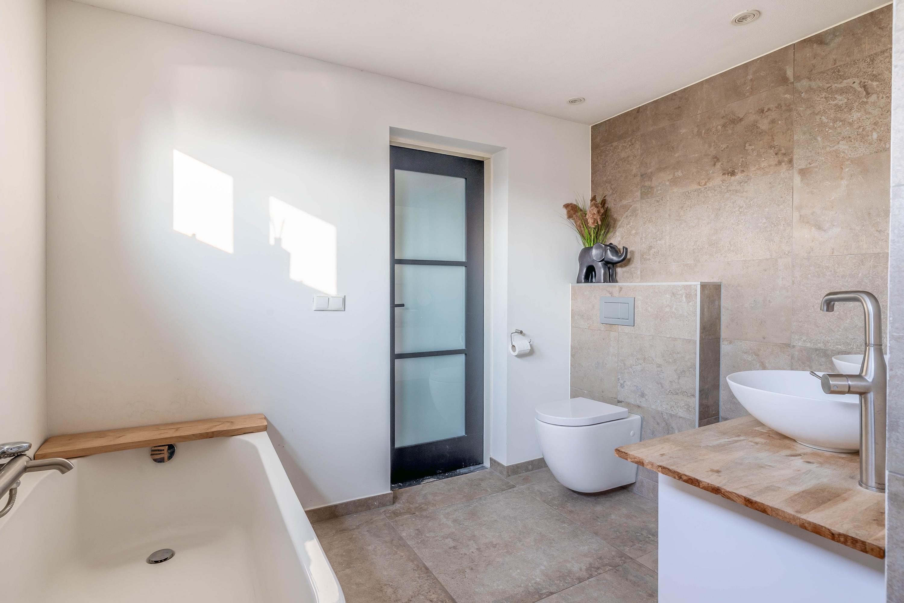 Op de eerste verdieping zijn er drie slaapkamers, waaronder een ouderslaapkamer met inloopkast. De badkamer is voorzien van een inloopdouche, ligbad en dubbele wastafel. De onderhoudsvriendelijke tuin op het zuidoosten heeft een overkapping en een royale schuur.