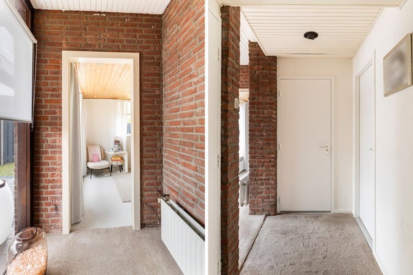 Via de entree met overkapping komt u binnen in de gelijksvloerse woning. De karakteristieke Z-vormige hal vormt het centrale punt van het huis en biedt toegang tot de drie slaapkamers, het separate toilet, de doucheruimte, de gesloten keuken en de L-vormige woonkamer.