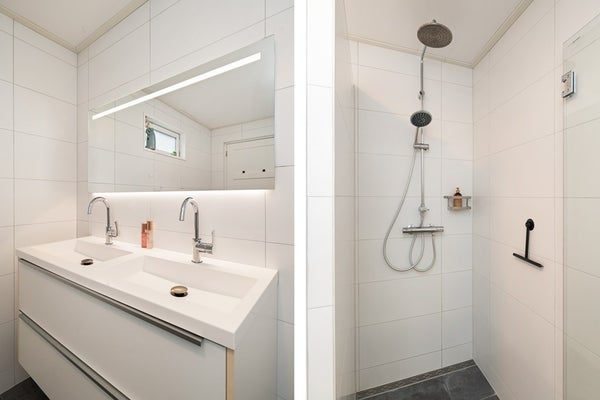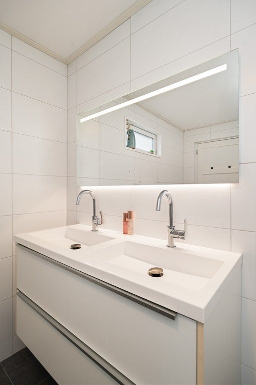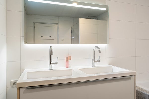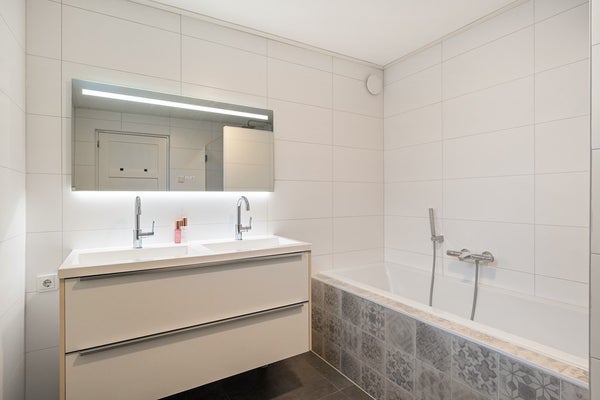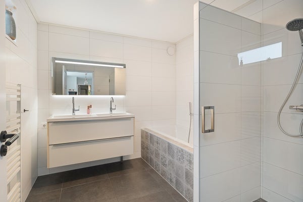 Vanuit de keuken is er toegang tot de ruime en luxe badkamer, voorzien van een comfortabel ligbad, een royale inloopdouche, een dubbel wastafelmeubel en een verwarmde spiegel.