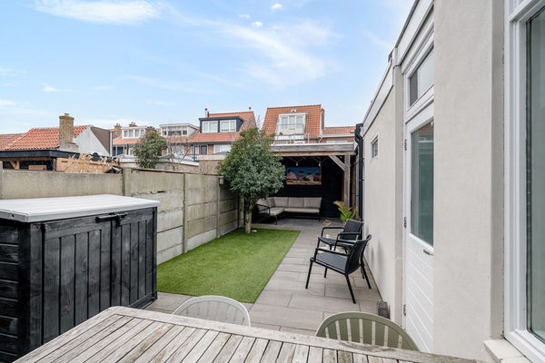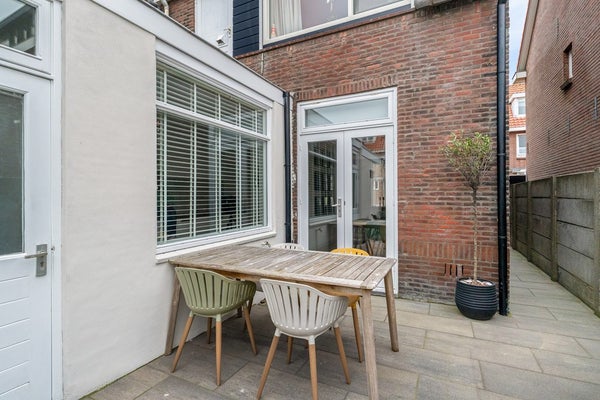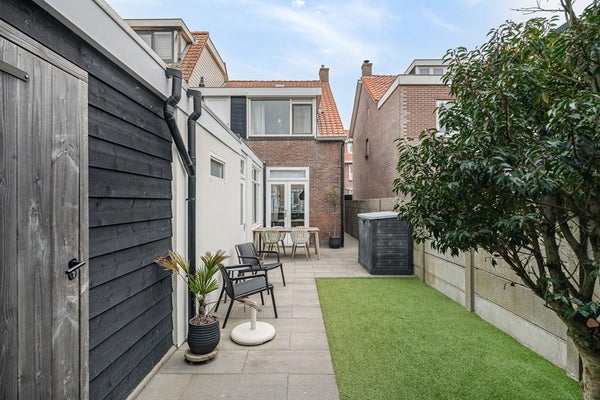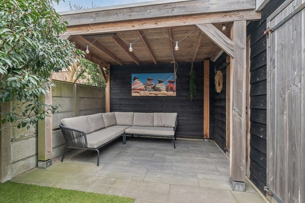 De zonnige achtertuin van ca. 12 meter diep is perfect gelegen op het zuidwesten en is fraai aangelegd. Achterin vind je een sfeervolle houten veranda (ca. 9 m²) – een fijne plek om te ontspannen. Door de gunstige tuin ligging is er zon tot in de avonduren.