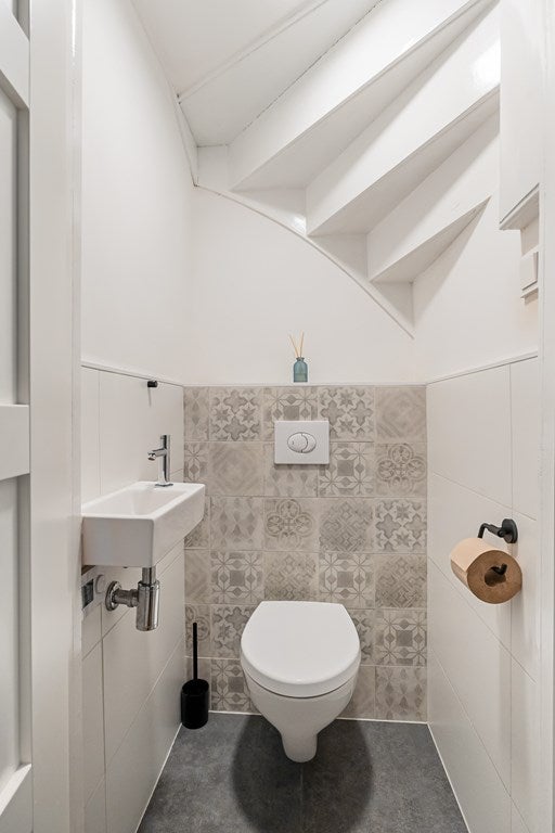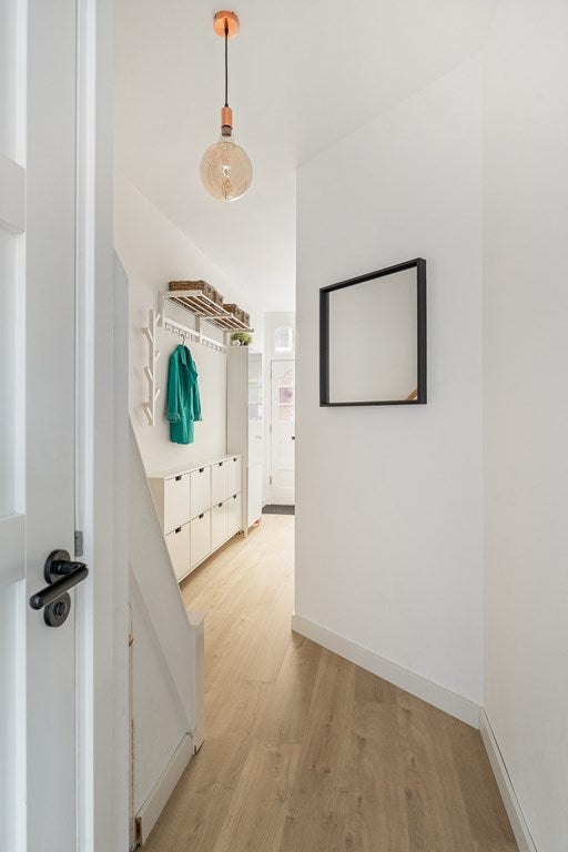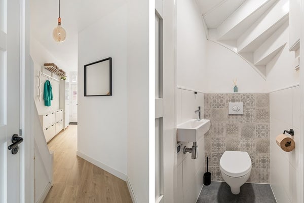 Entree / ruime hal, met een uitgebreide meterkast, garderoberuimte, moderne toiletruimte, trapopgang naar de verdieping en toegang tot de woonkamer.