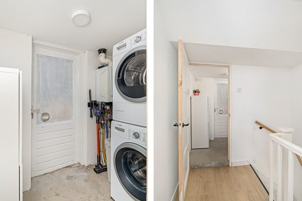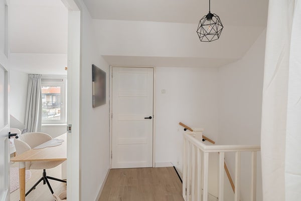 De overloop biedt toegang tot drie slaapkamers, waarvan twee aan de voorzijde en één ruime aan de achterzijde met dakkapel. Ook is er een aparte was-/stookruimte aanwezig en toegang tot het platte dak. Een vaste trap leidt naar de zolderverdieping.