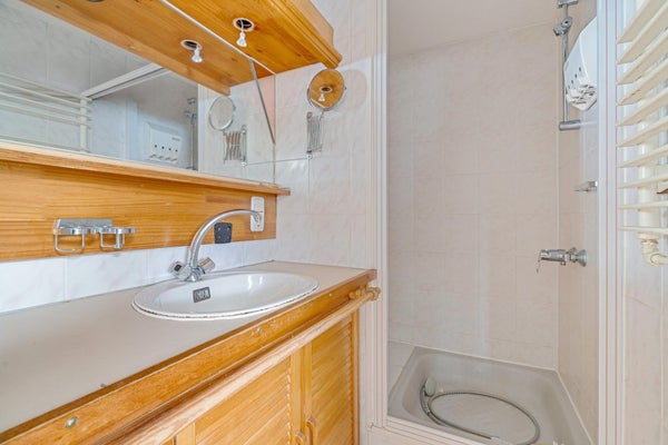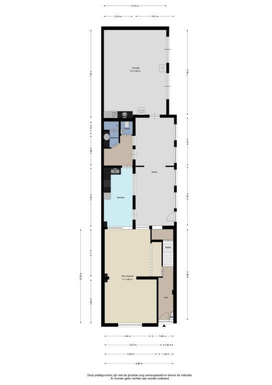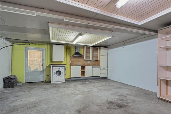 In het souterrain vindt u extra bergruimte en de cv-installatie. De begane grond heeft een sfeervolle woonkamer met een glas-in-loodraam, de keuken is praktisch ingericht en biedt toegang tot de serre en badkamer. Op de eerste verdieping zijn er een royale woonruimte met open keuken, een slaapkamer met wastafel, en toegang tot het dakterras. De tweede verdieping biedt twee slaapkamers en een muurkast. De garage beschikt over twee kantelpoorten en een keukenblok.