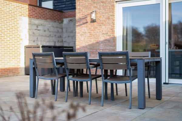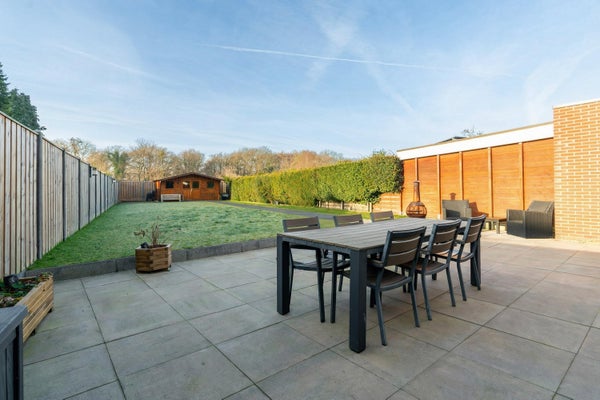 De nieuw aangelegde achtertuin combineert een groot betegeld zitgedeelte met veel groen en is diep van opzet. Via een pad aan de rechterzijde van de woning is directe toegang tot de tuin.