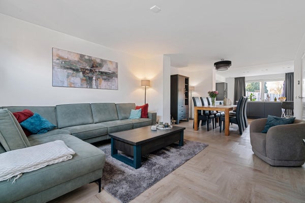De woonkamer staat in open verbinding met de moderne keuken die gelegen is in de aanbouw.