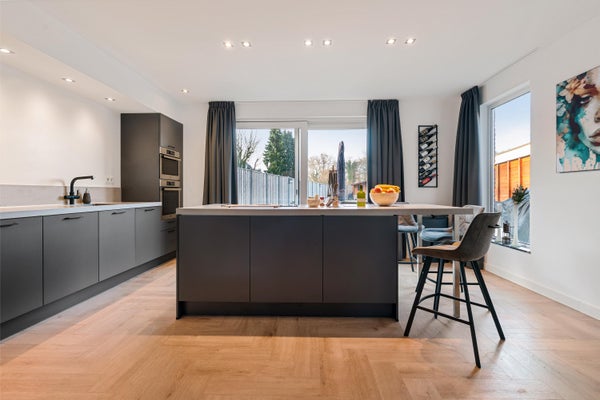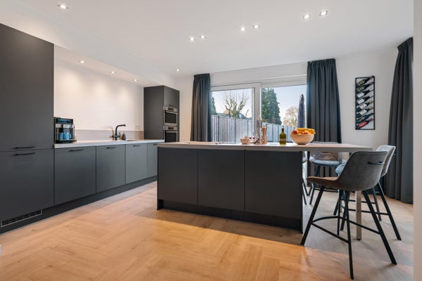 De open keuken is voorzien van grote raampartijen die zorgen voor veel lichtinval en direct tuincontact door de schuifpui. De keuken is ingericht met een kookeiland met zitgedeelte en kastenwand die beide van alle gemakken zijn voorzien: Inductiekookplaat met geïntegreerde afzuiging (Bora), vaatwasser, aqua hotkraan, combi-oven, magnetron, koelkast en spoelbak (Keuken apparatuur van het merk Whirlpool). De woonkamer met zit en eetgedeelte is eveneens verbonden met een tussenhal die toegang geeft tot het luxe betegelde toilet met fonteintje, moderne meterkast en deur naar het souterrain.