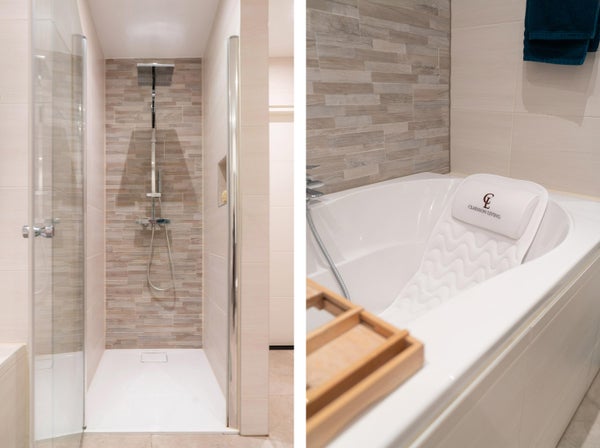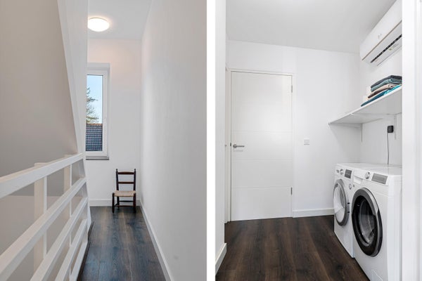 Op de eerste verdieping vindt u drie slaapkamers (allen met laminaatvloer), CV ruimte en luxe badkamer. De overloop beschikt over een airco die zorgt voor aangenaam comfort en aansluitingen voor het witgoed. De luxe betegelde badkamer is voorzien van een ligbad, toilet, inloopdouche met regendouche en een vaste wastafel met meubel. Vanuit de overloop is tevens de vaste trap naar de tweede verdieping.