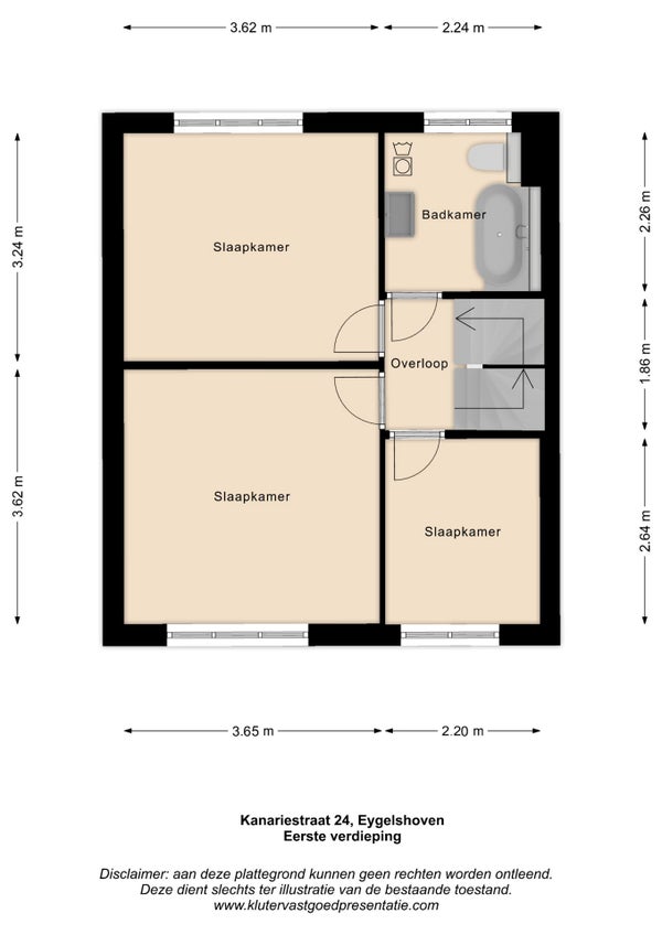 Overloop. Drie slaapkamers, respectievelijk groot: 3.62/3.62, 3.62/3.24 en 2.64/2.24. Badkamer 2.26/2.24, een ligbad met douche, toilet, een grote wastafel in meubel en de witgoedaansluitingen. De slaapkamers en overloop zijn voorzien van een doorlopende laminaatvloer, kunststof kozijnen met HR++ beglazing en rolluiken.