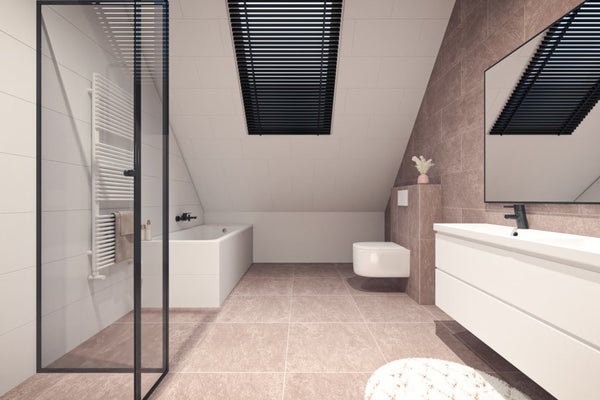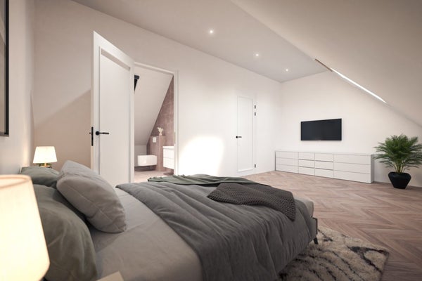 De tweede verdieping wordt een loftachtige masterbedroom met vrijstaand bad, gescheiden door verticale houten balken. Dit huis biedt luxe, comfort en privacy, perfect voor een aangename woonervaring.