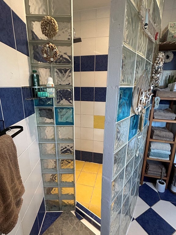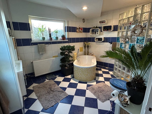 Badkamer 4,05 x 3,15 met plavuizenvloer met elektrische vloerverwarming, inbouwspots, ligbad, inloopdouche, hangtoilet en badkamermeubel met wastafel met 2 kranen.