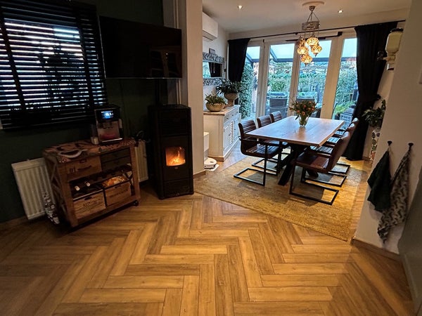 Woonkamer 6,15 x 4,00 met laminaatvloer, inbouwspots en houtkachel (ter overname).