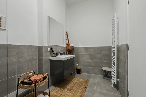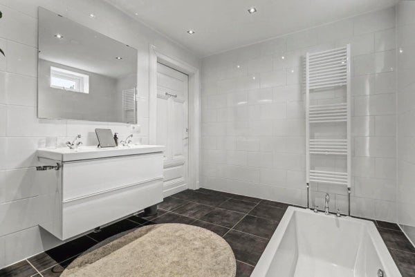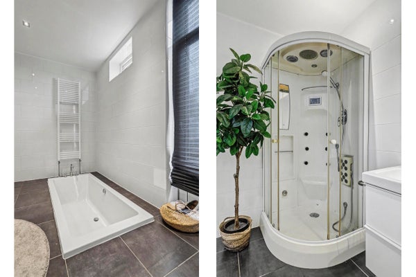 Badkamer: ca. 3,67 x 2,79 m, volledig betegeld en uitgerust met verzonken ligbad, douchecabine, dubbele wastafel met meubel en designradiator.