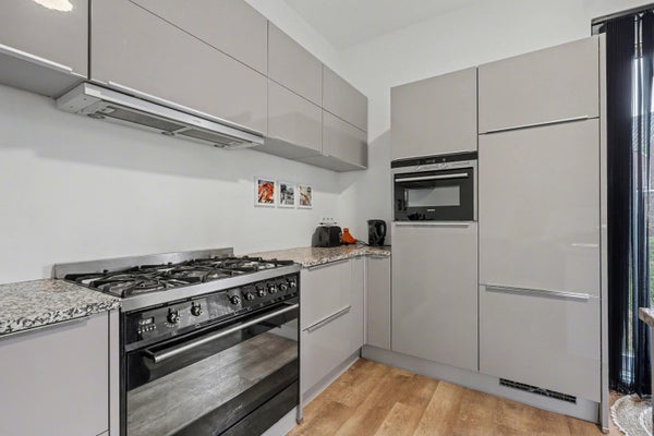 Leefkeuken: ca. 4,51 x 3,82 m, met royale schuifpui naar het terras en luxe hoogglans keukeninrichting met spoel-/werkeiland. Voorzien van hoogwaardige apparatuur, waaronder koelkast met vershoudlades, 4-lades vriezer, 6-pits gasfornuis (SMEG) met oven, inductiekookplaat, vaatwasser, combi-oven en RVS afzuigkap.
