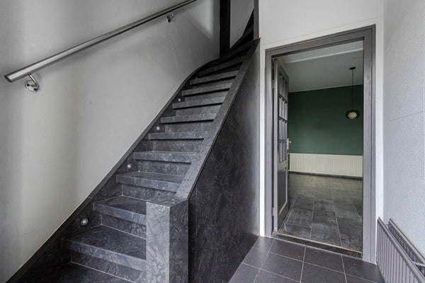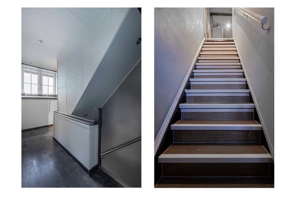 Via de opnieuw beklede trap bereiken we de overloop van de eerste verdieping. Vanaf hier is er toegang tot drie slaapkamers met een oppervlakte van circa 12,4 m², 7,5 m² en 9,2 m², waarvan één slaapkamer is voorzien van een praktische bergkast. De gehele verdieping is afgewerkt met dezelfde antracietkleurige laminaatvloer, wat zorgt voor een rustige en uniforme uitstraling.