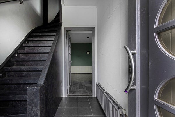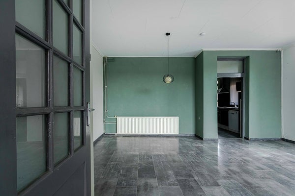 We betreden de woning via de entree, die toegang biedt tot de meterkast en de woonkamer. De woonkamer heeft een oppervlakte van circa 32,5 m² en is afgewerkt met een antracietkleurige laminaatvloer. Dankzij de raampartijen aan zowel de voor- als zijkant geniet de ruimte van veel natuurlijk daglicht. De ramen zijn voorzien van een vakverdeling, wat zorgt voor extra sfeer en karakter.