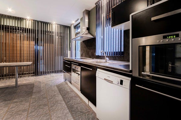 Aansluitend bereiken we de gesloten keuken van circa 14 m², met uitzicht over de achtertuin. De keuken is uitgerust met diverse inbouwapparatuur, waaronder een elektrische kookplaat (2025), afzuigkap, combi-magnetron, oven, vaatwasser en een koelkast met vriezer. Daarnaast beschikt de keuken over een vaste eettafel en is deze afgewerkt met een tegelvloer.