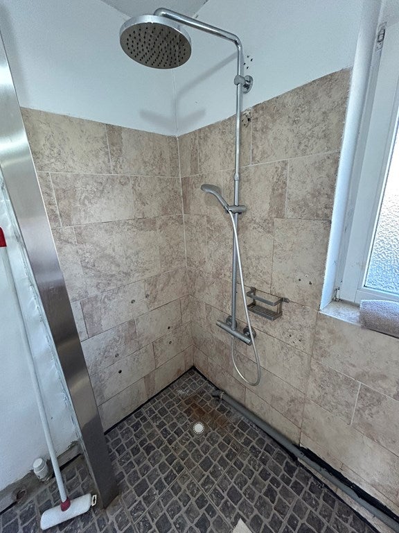 Badkamer 2,10 x 2,05 met tegelvloer, inloopdouche en badkamermeubel met 2 wastafels.