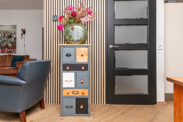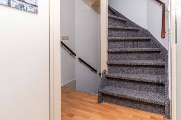 Centraal in de woning bevindt zich het afgesloten portaal met de trapopgang naar de eerste verdieping en het vernieuwde toilet, wat bijdraagt aan het moderne en verzorgde geheel.