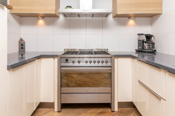 Aan de achterzijde ligt de lichte inbouwkeuken, compleet uitgerust met alle benodigde inbouwapparatuur.