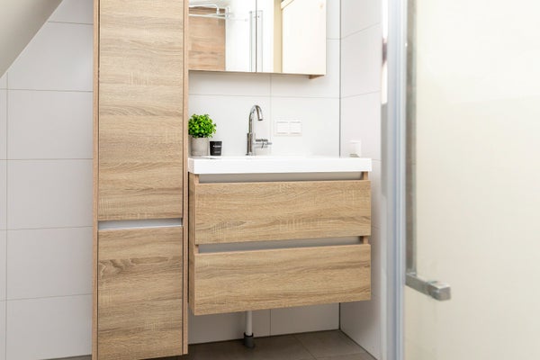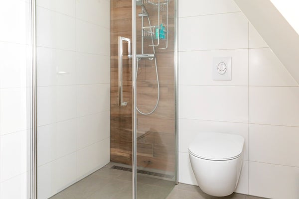 De vernieuwde, lichte badkamer is praktisch en stijlvol ingericht met een douche, toilet en badmeubel.