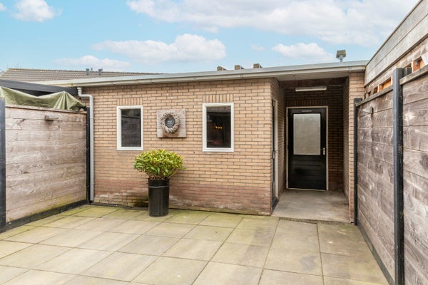Achter in de tuin staat een stenen berging en via de achterom is de tuin gemakkelijk bereikbaar.