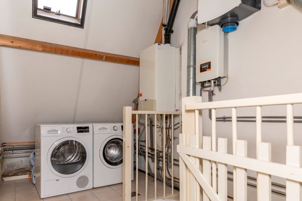 Op de overloop zijn de aansluitingen voor wasmachine en droger aanwezig.