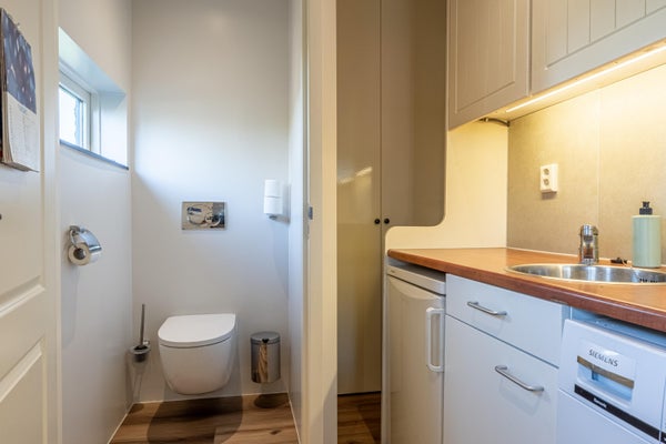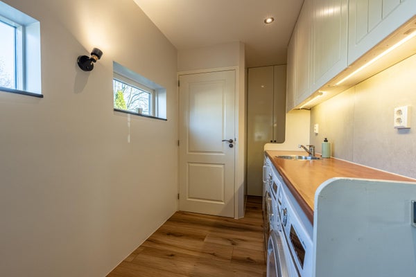 Via de veranda bereik je de bijkeuken, die tevens als praktische achterentree fungeert. Hier bevinden zich een extra keukenblok, de opstelplaats voor wasmachine en droger en de Remeha HR-ketel (2021). Het toilet is in 2025 vernieuwd.