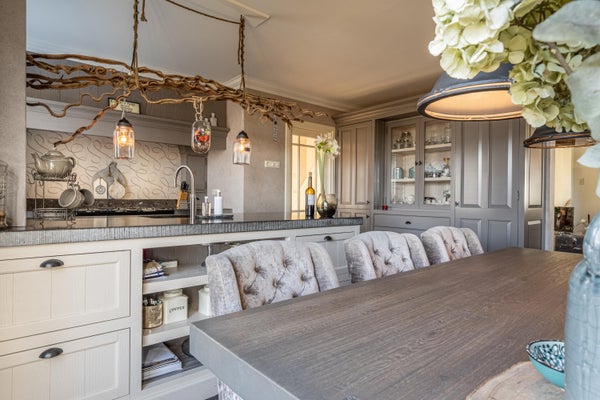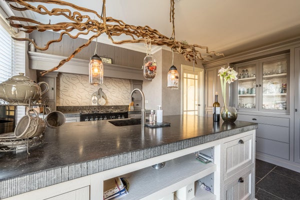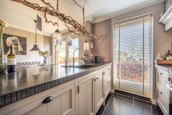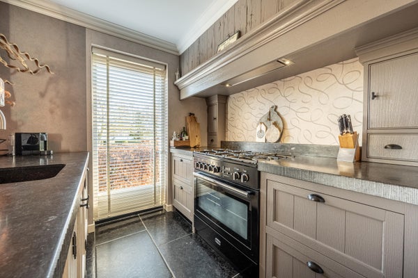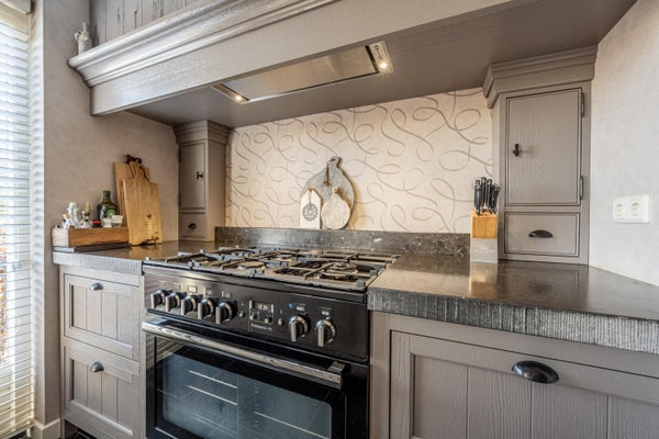 De keuken (2015) is op maat gemaakt in een warme taupe/beige kleurstelling. Het Belgisch hardstenen blad, de vloerverwarming, het 5-pits Falcon fornuis, de Novy afzuigkap en de Liebherr koel-vriescombinatie geven het geheel een robuuste, landelijke uitstraling. In 2024 zijn Quooker en vaatwasser vernieuwd.