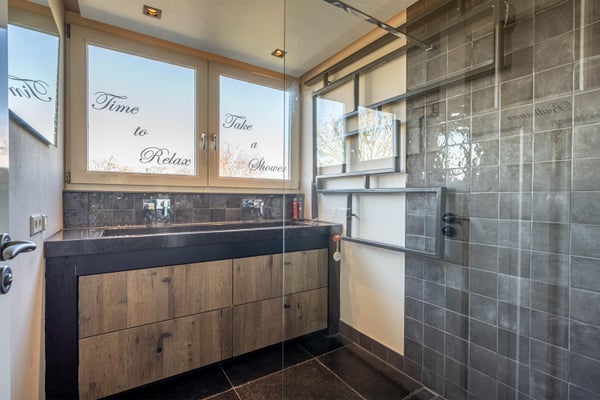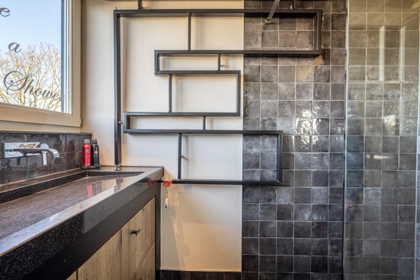 De badkamer (2019) is modern uitgevoerd met keramisch hardsteen, een breed wastafelmeubel, inloopdouche met stortvoorziening, designradiator en indirecte verlichting. Vanuit de dakkapel geniet je ook hier van het open polderlandschap.