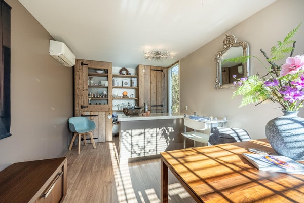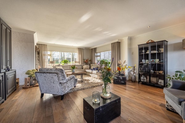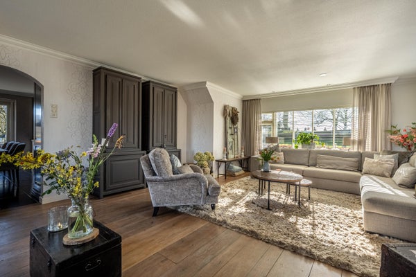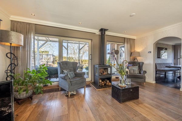 De woonkamer ademt sfeer. De massief eiken vloer – getrommeld en geloogd – vormt samen met het hardsteen een fraai geheel. Grote raampartijen en de schuifpui zorgen voor veel licht en een directe verbinding met de veranda. De houtkachel maakt het in de wintermaanden extra behaaglijk.