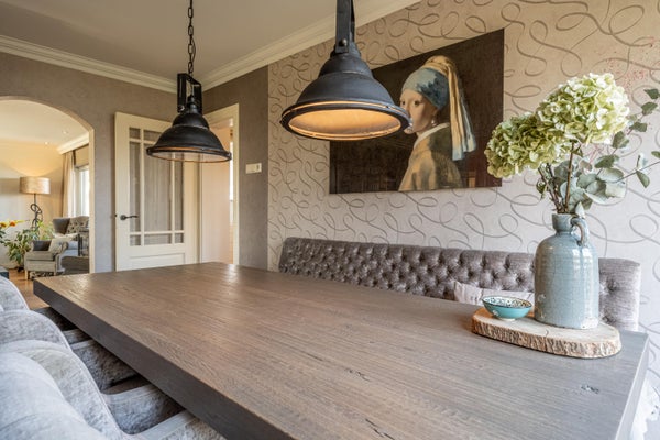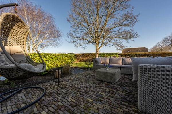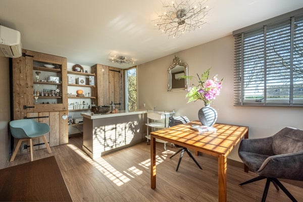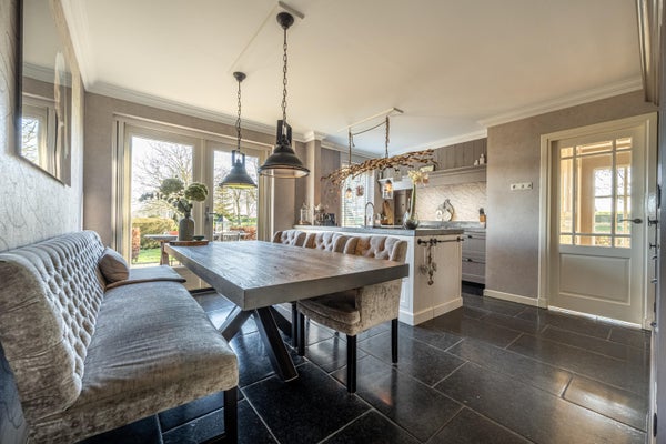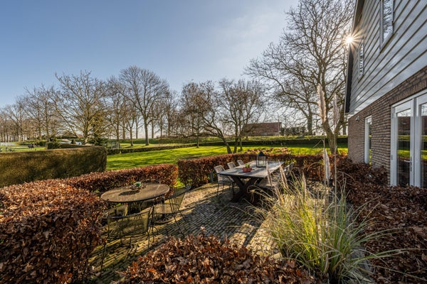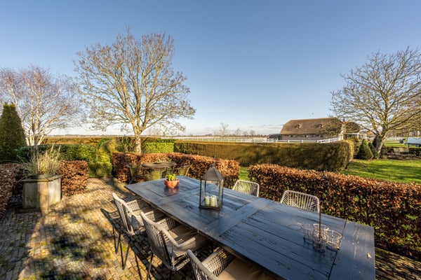 De openslaande deuren nodigen uit naar het terras, waar het uitzicht over de polder direct je aandacht trekt.