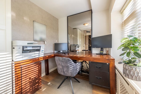 Je betreedt de woning via de sfeervolle entree met lambrisering en vaste kastruimte. Direct aan de voorzijde ligt de werkkamer, ideaal als thuiswerkplek.