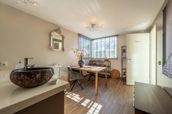 Vrijstaand in de tuin bevindt zich een aparte unit van circa 23m². Met eigen entree, toiletruimte en airconditioning is dit een uitstekende ruimte voor een zelfstandige in bijvoorbeeld de zorg, een kantoor aan huis of hobbymatig gebruik.