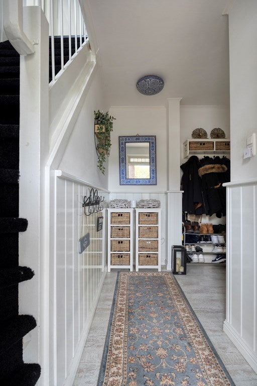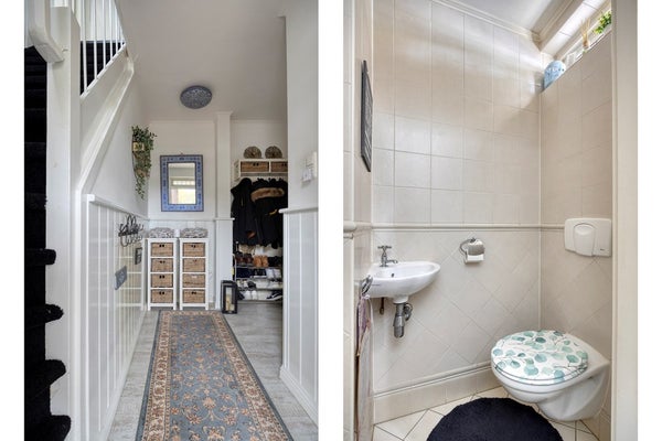 Dankzij de overkapping / carport stap je altijd droog de woning binnen. Via de sfeervolle hal is het toilet te bereiken en ook de keuken.