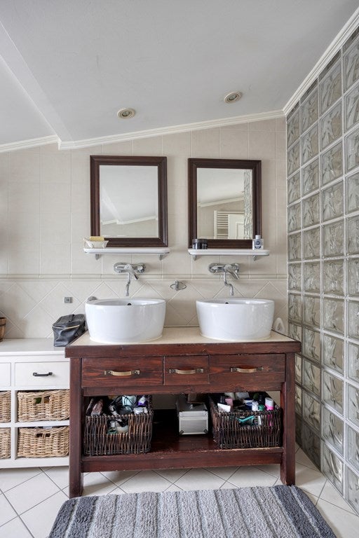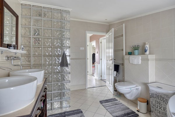 De badkamer is zeer compleet. Een hoekbad, twee wastafels, een hangtoilet en inloopdouche maken het geheel compleet.