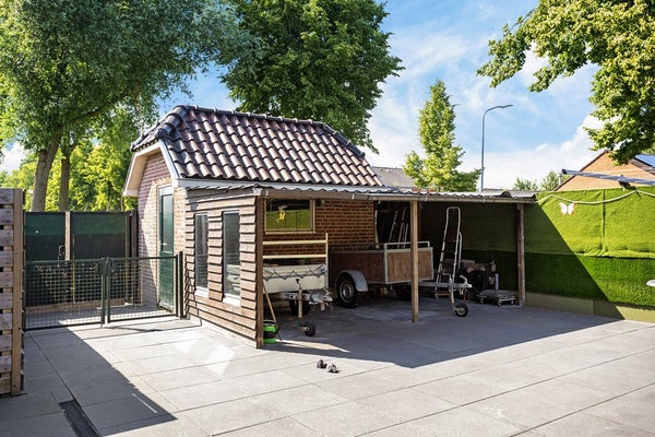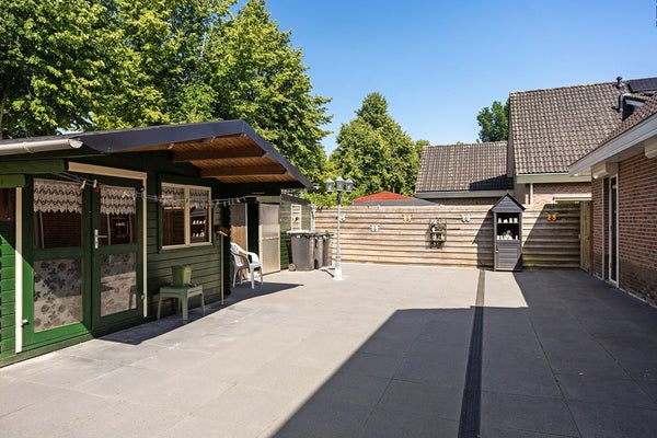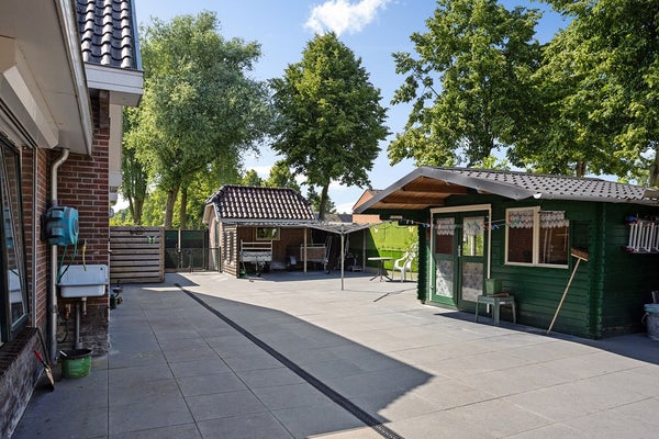 De achtertuin is volledig betegeld en voorzien van verschillende schuurruimtes