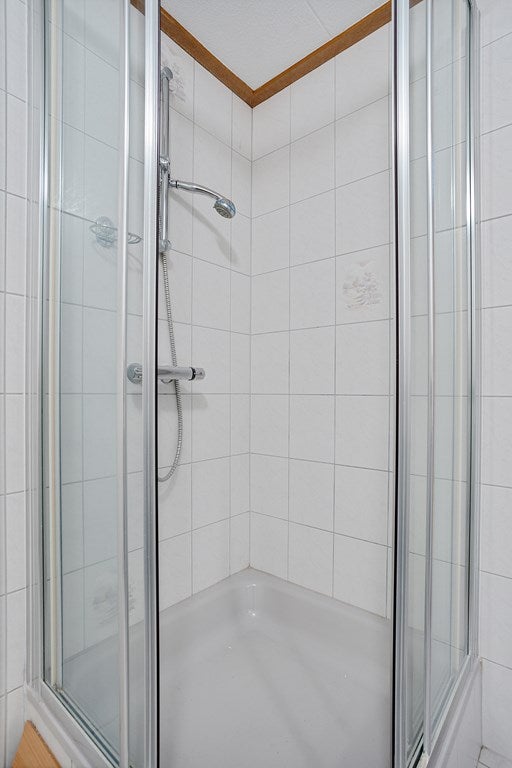 Overloop, ouderslaapkamer met balkon, slaapkamer met dubbele kastruimte, en een slaapkamer met dakraam en toegang tot de werkzolder. Badkamer met douchecabine, wastafel en toilet.