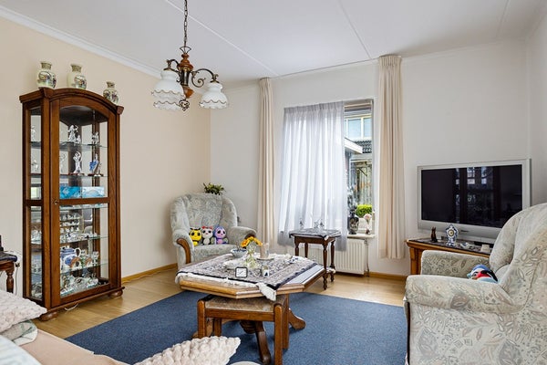 Hal met trapopgang, toilet, meterkast. L-vormige woonkamer met erker, woonkeuken met nieuwe inbouwkeuken en tuindeuren, bijkeuken met cv-ketel en achteringang, slaapkamer, badkamer en garage met vaste trap naar de 1e verdieping.