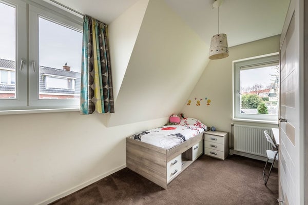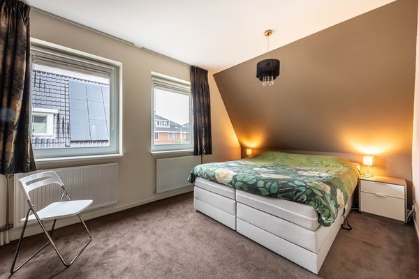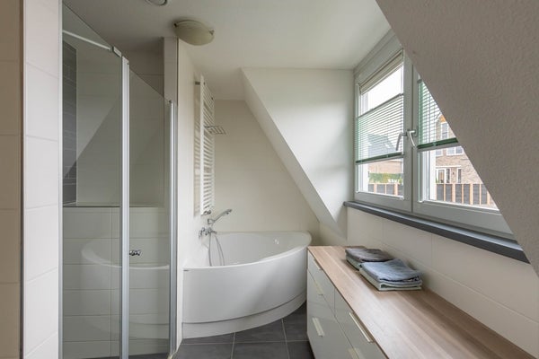 Op de eerste verdieping bevinden zich drie slaapkamers, de badkamer en het separatie toilet. De master bedroom aan de voorzijde is gelegen over de volle lengte van de woning en heeft een vaste kastenwand. De overige twee slaapkamers op deze verdieping zijn prettig ruim van afmeting en hebben een fijne lichtinval. De moderne badkamer is uitgerust met een inloopdouche, een hoekbad en een brede wastafel met wastafelmeubel. De ruimte is geheel betegeld en heeft een natuurlijke lichtinval. Hier is het heerlijk ontspannen!
