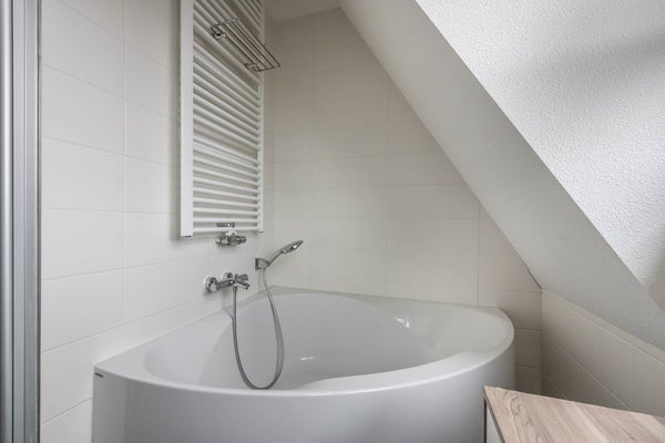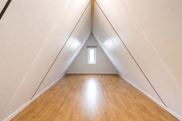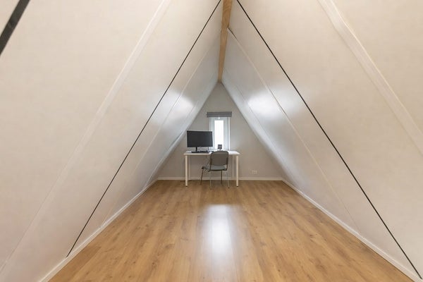 De zolder is bereiken via een vaste trap en heeft aan weerszijden een raam. Ideaal als speel- en/of werkplek en voor het opbergen van de niet-direct-nodig-spullen. Hier bevinden zich de hybride warmtepomp en de cv-ketel.