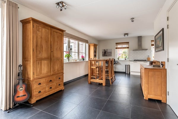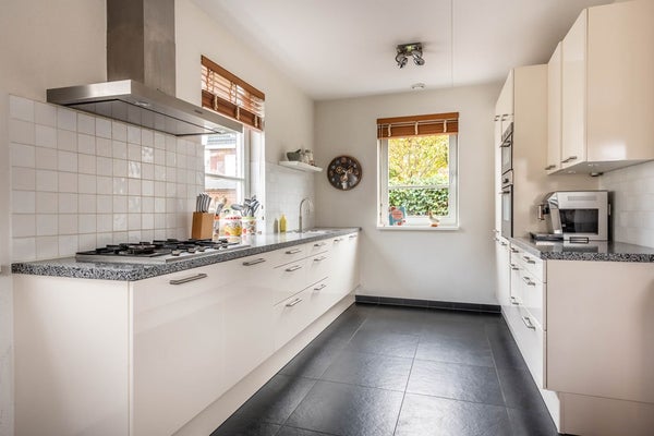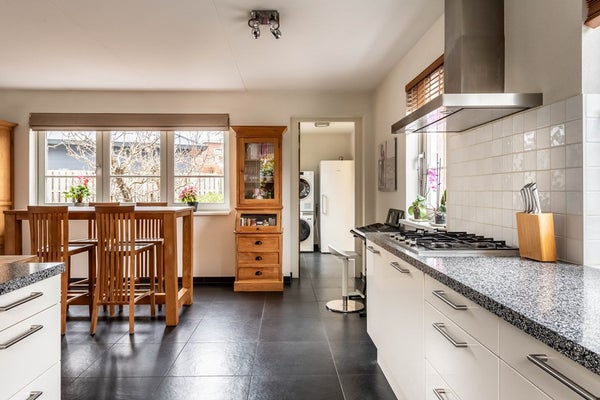 De keuken is uitgerust met een 5-pits gaskookplaat, een afzuigkap, een vaatwasser, een oven, een magnetron, een koelkast en een quooker. De kasten en lades bieden voldoende opbergruimte voor al uw keukenbenodigdheden. Aan het fraaie en praktische composiet aanrechtblad bereidt je de heerlijkste gerechten om samen met familie en/of vrienden van te genieten. Via de keuken is de bijkeuken te bereiken. Hier vind je de aansluitingen voor de wasmachine en de droger en de toegangsdeuren naar de tuin en de garage.