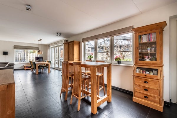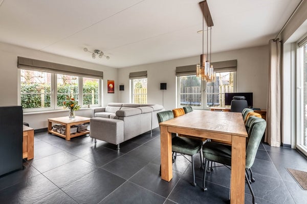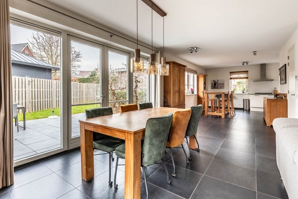 De hal geeft tevens direct toegang tot de ruime woonkamer met open keuken. De tuingerichte woonkamer biedt, middels openslaande deuren, directe toegang tot de tuin, waardoor binnen en buiten moeiteloos in elkaar overlopen. De ramen rondom zorgen voor een fijne lichtinval.