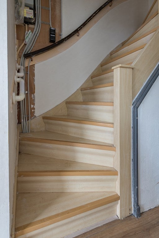 De vloer op de gehele benedenverdieping is met een houtmotief laminaat bekleed en de wanden zijn gestucd.