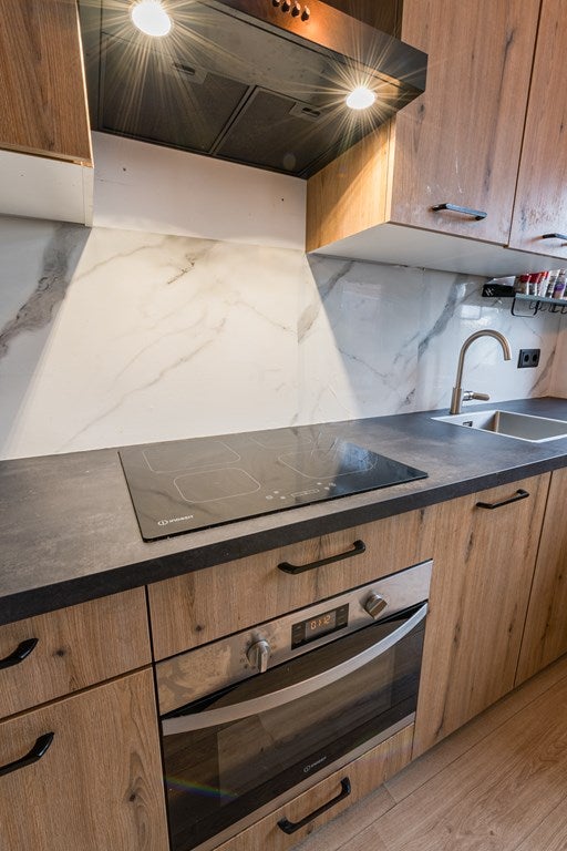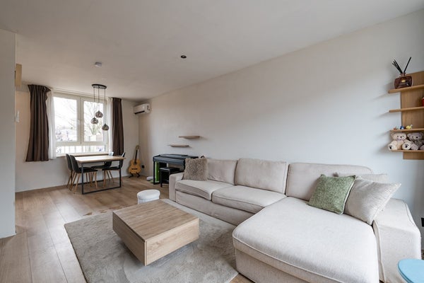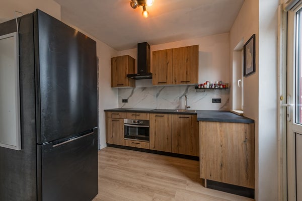 Via de hal met toilet, vaste trap naar boven, meterkast en trap naar kelder, komen we in de gezellige woonkamer. Deze woonkamer is voorzien van een LG Inverter airco. Aan de achterkant van het object bevindt zich de open keuken met L-opstelling. Het keukenblok is voorzien van een combi-oven, inductiekookplaat, afzuigkap en een vaatwasmachine (45cm breed).