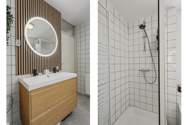 De badkamer is compleet uitgevoerd en voorzien van een douche, ligbad, dubbele wastafel en toilet.