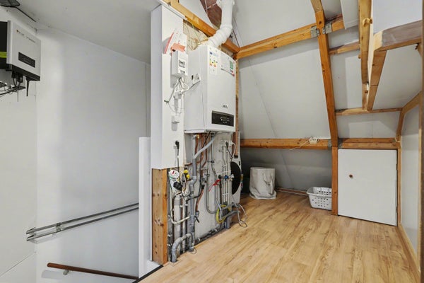 Overloop met opstelling voor de CV-ketel (huur, Volta), mechanische ventilatie en wasmachine