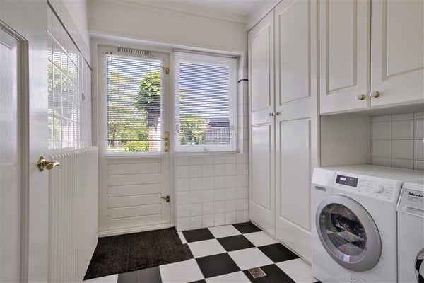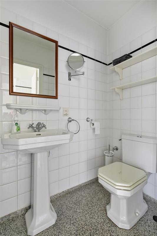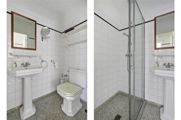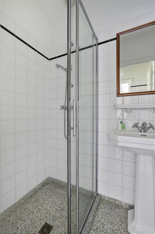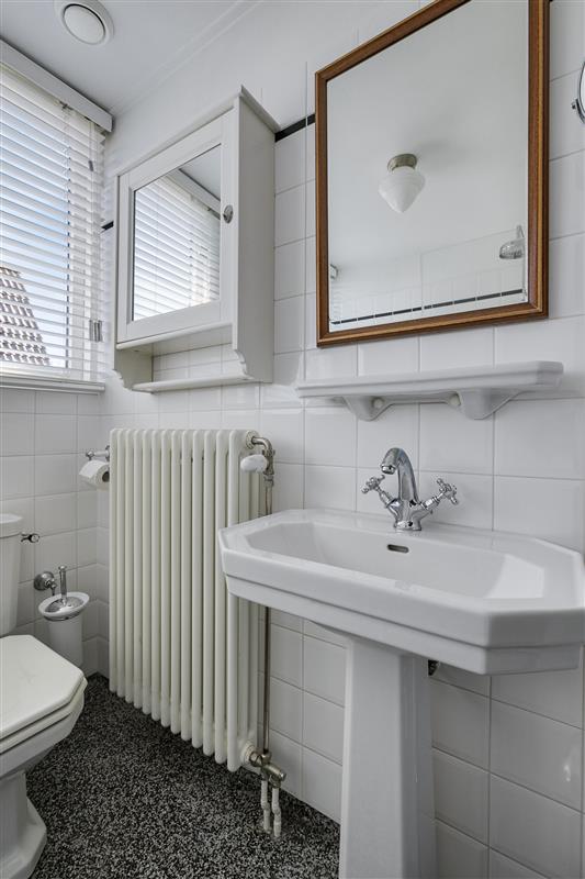 Naast de zitkamer tref je een hal met toegang tot de wasruimte met bergruimte, inbouwkasten en de badkamer met douche, toilet en wastafel, waardoor je in dit huis levensloopbestendig zou kunnen wonen.