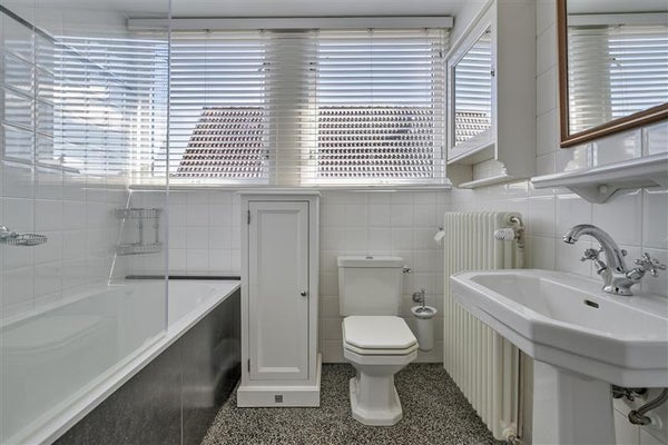 De badkamer op deze verdieping is volledig betegeld in de stijl van het huis en is ingedeeld met een ligbad met regendouche, een toilet en een wastafel.