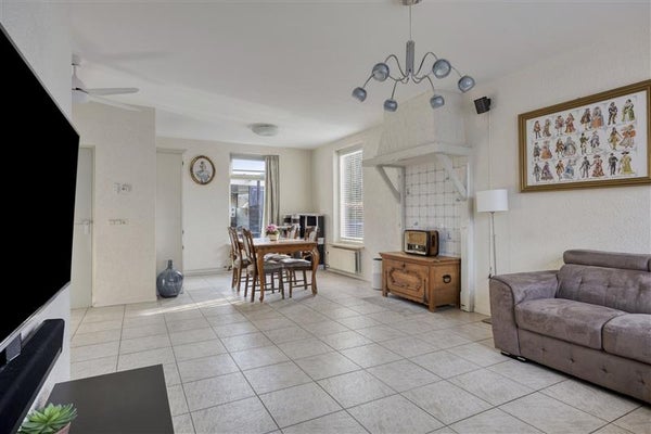 De woonkamer is licht en ruim, met grote raampartijen, een sfeervolle schouw en een nette tegelvloer met vloerverwarming (doorlopend van bijkeuken t/m woonkamer). Aan de achterzijde ligt de royale woon-/eetkeuken met keukenopstelling voorzien van o.a. kookplaat, afzuigkap, oven en koelkast.